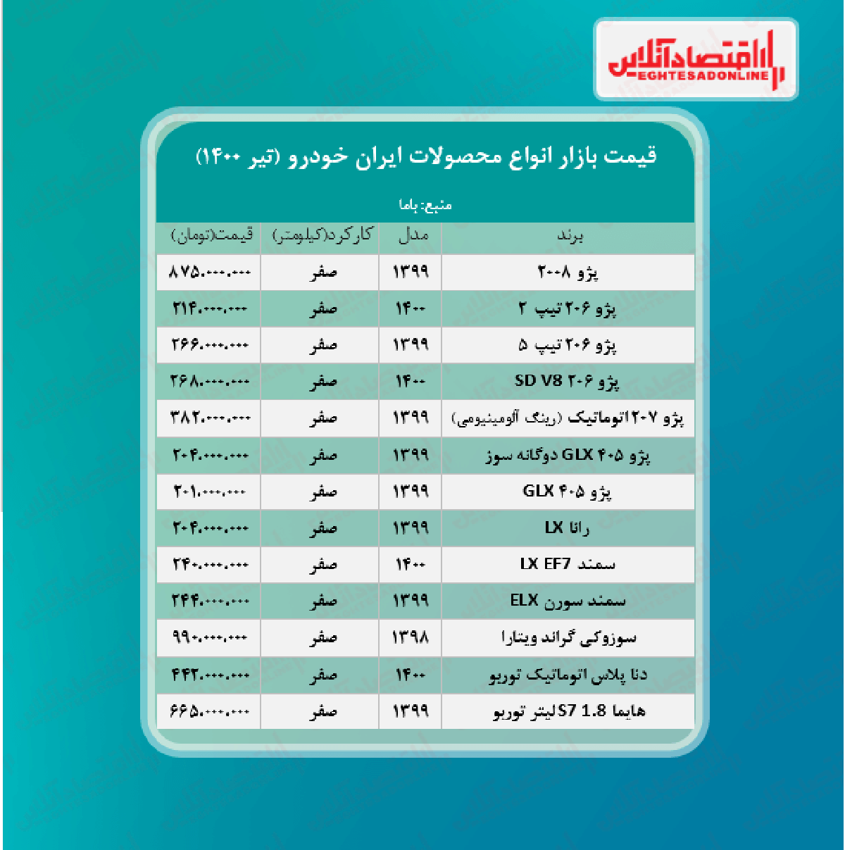 قیمت محصولات ایران خودرو امروز ۱۴۰۰/۴/۱۰