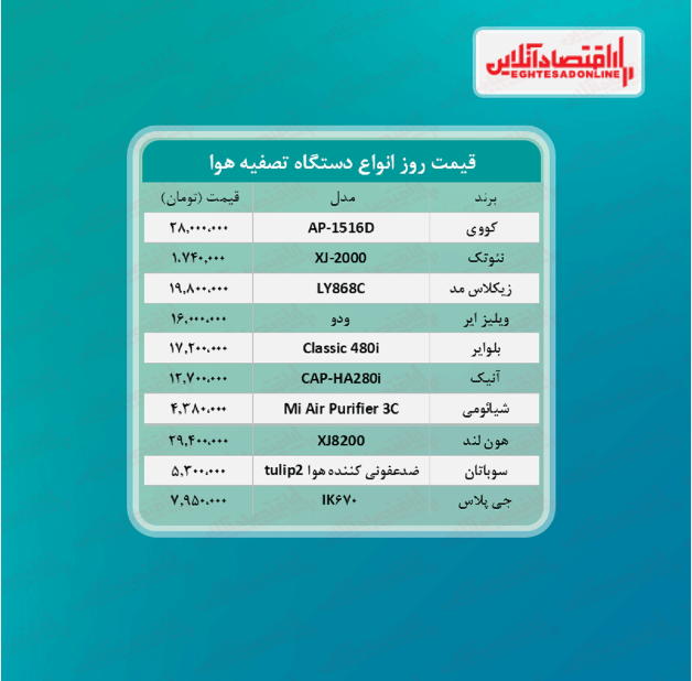 اقتصاد آنلاین -سمانه‌ باقری: آنچه در زیر می‌آید جدول قیمت روز انواع دستگاه تصفیه هوا در سایت‌های فروش اینترنتی است؛