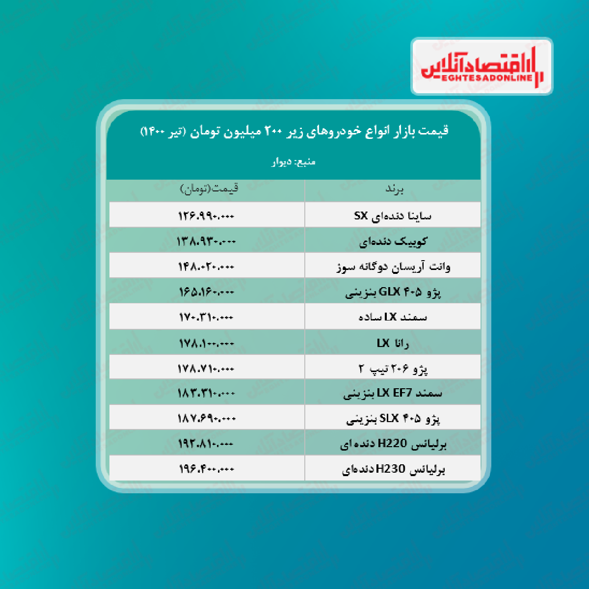 قیمت روز خودروهای دست دوم زیر 200 میلیون بازار