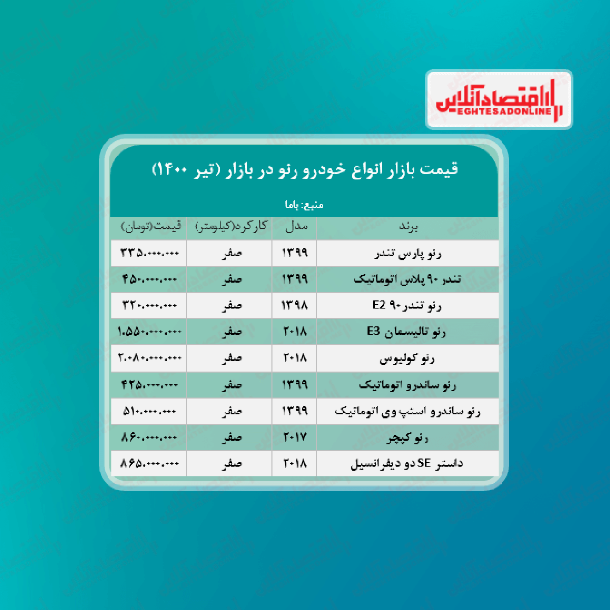 اقتصاد آنلاین - پیام مصطفایی: در جدول زیر قیمت روز انواع سواری رنو در بازار آزاد را مشاهده می‌کنید.