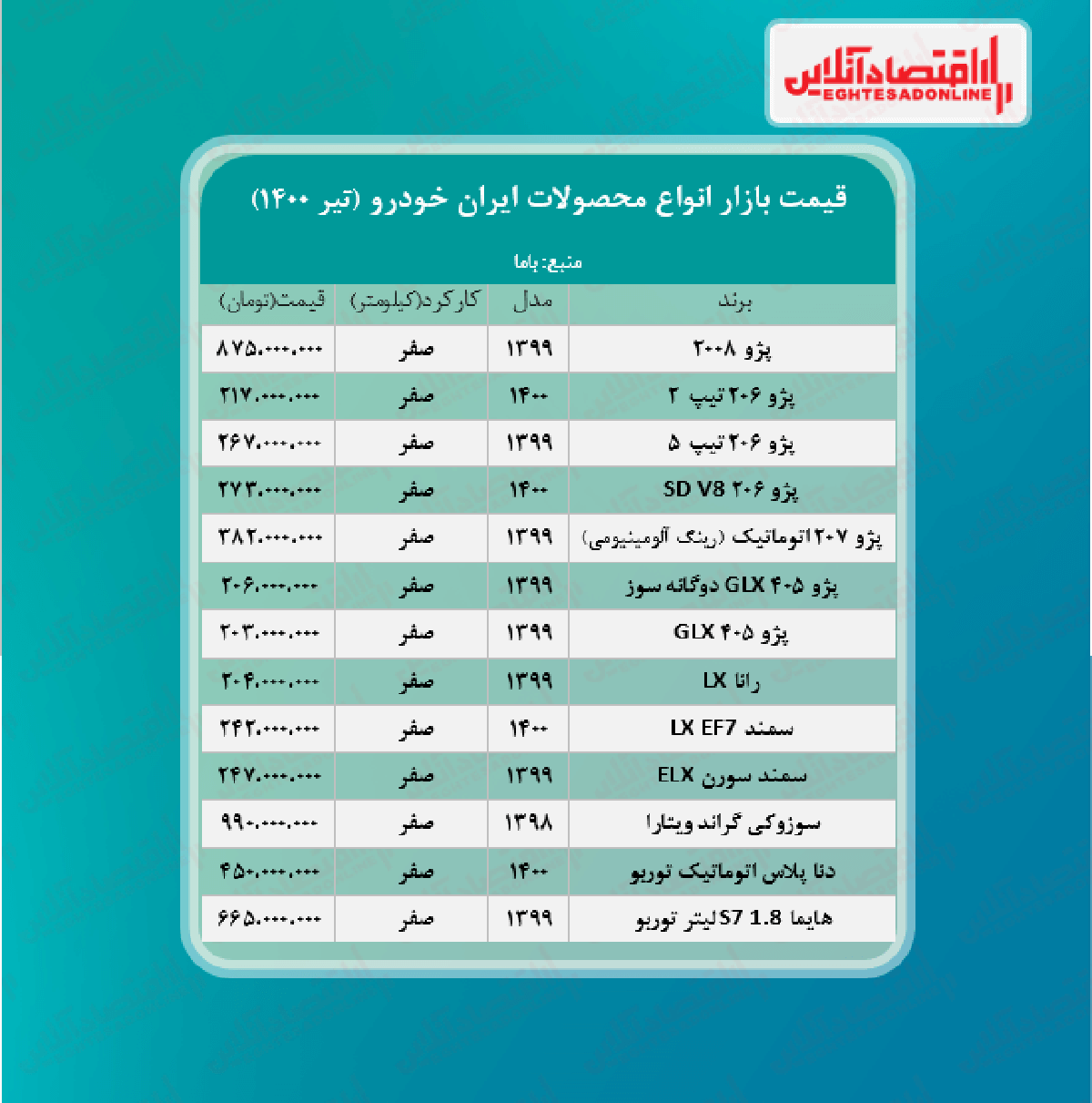اقتصاد آنلاین - پیام مصطفایی: در جدول زیر قیمت روز محصولات ایران خودرو در بازار آزاد را مشاهده میکنید.