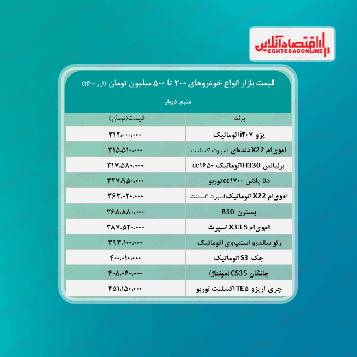 اقتصاد آنلاین - پیام مصطفایی: در جدول زیر قیمت خودروهای 300 تا 500 میلیون تومانی در بازار آزاد را مشاهده می‌کنید.
