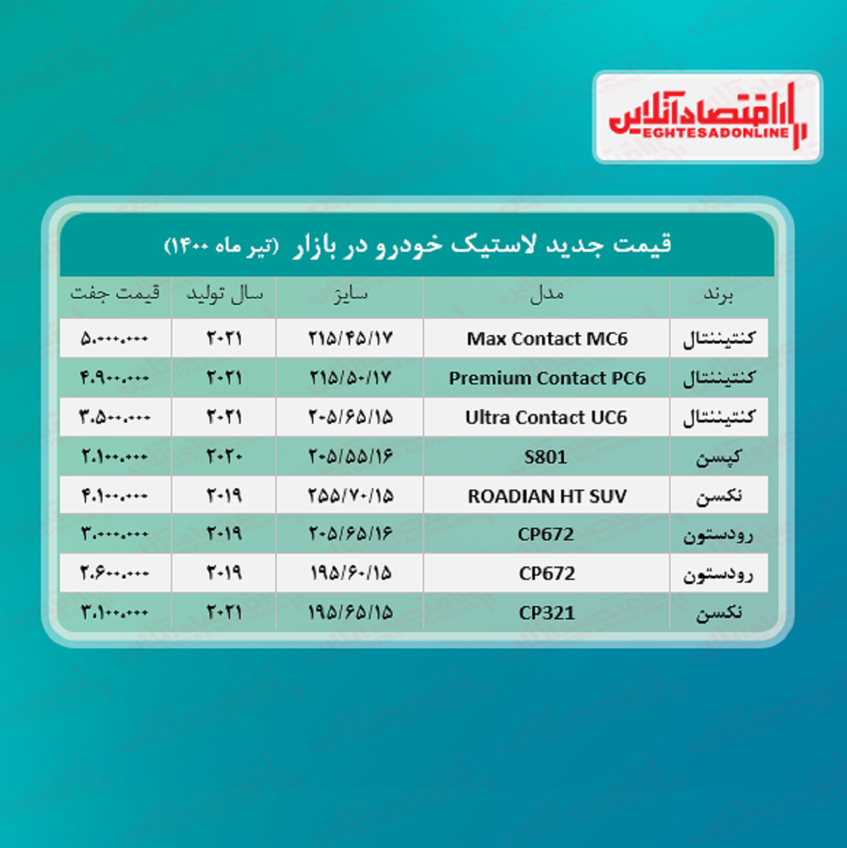 اقتصادآنلاین – فائزه بهرامی: قیمت جدید انواع لاستیک خودرو در سطح بازار تهران به شرح جدول زیر است؛