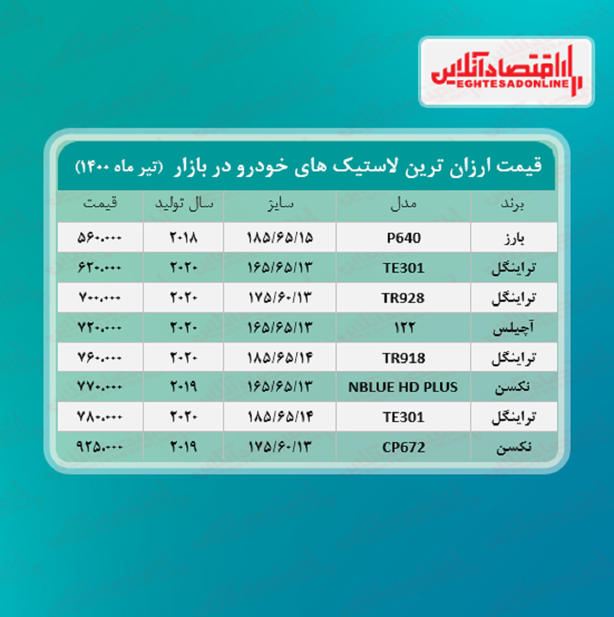اقتصادآنلاین – فائزه بهرامی: قیمت ارزان ترین لاستیک های خودرو در سطح بازار تهران به شرح جدول زیر است؛