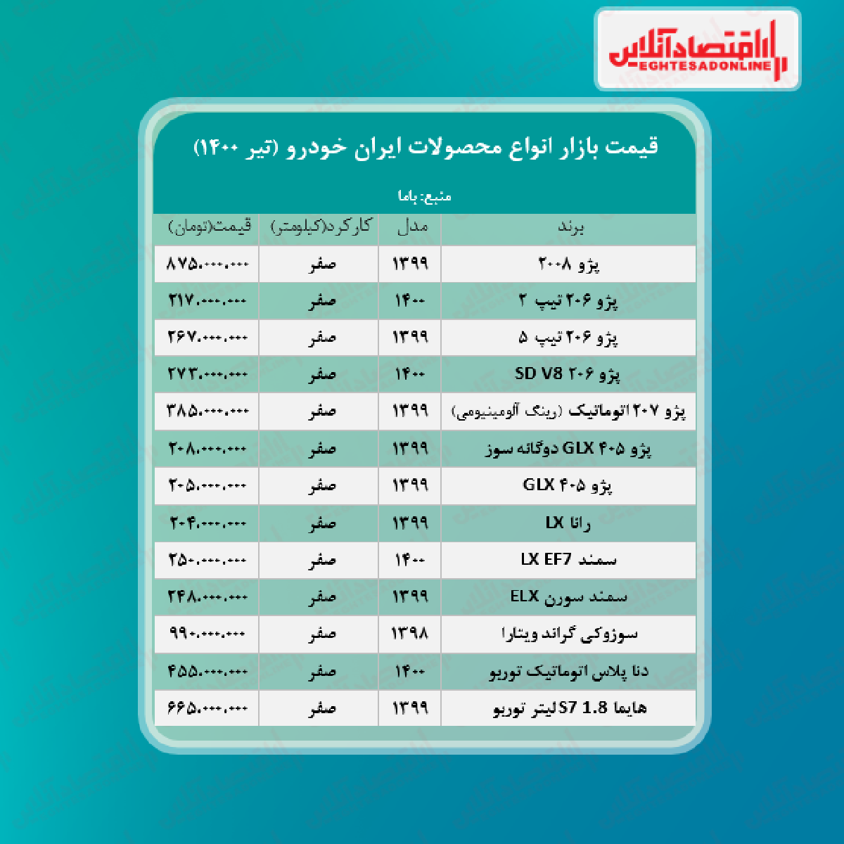 اقتصاد آنلاین - پیام مصطفایی: در جدول زیر قیمت روز محصولات ایران خودرو در بازار آزاد را مشاهده می‌کنید.