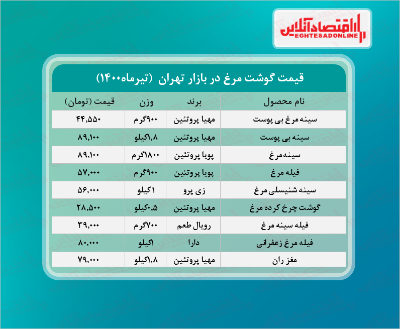 اقتصادآنلاین- مریم شریفی؛ آنچه در زیر می آید قیمت روز انواع گوشت مرغ در سطح بازار تهران است: