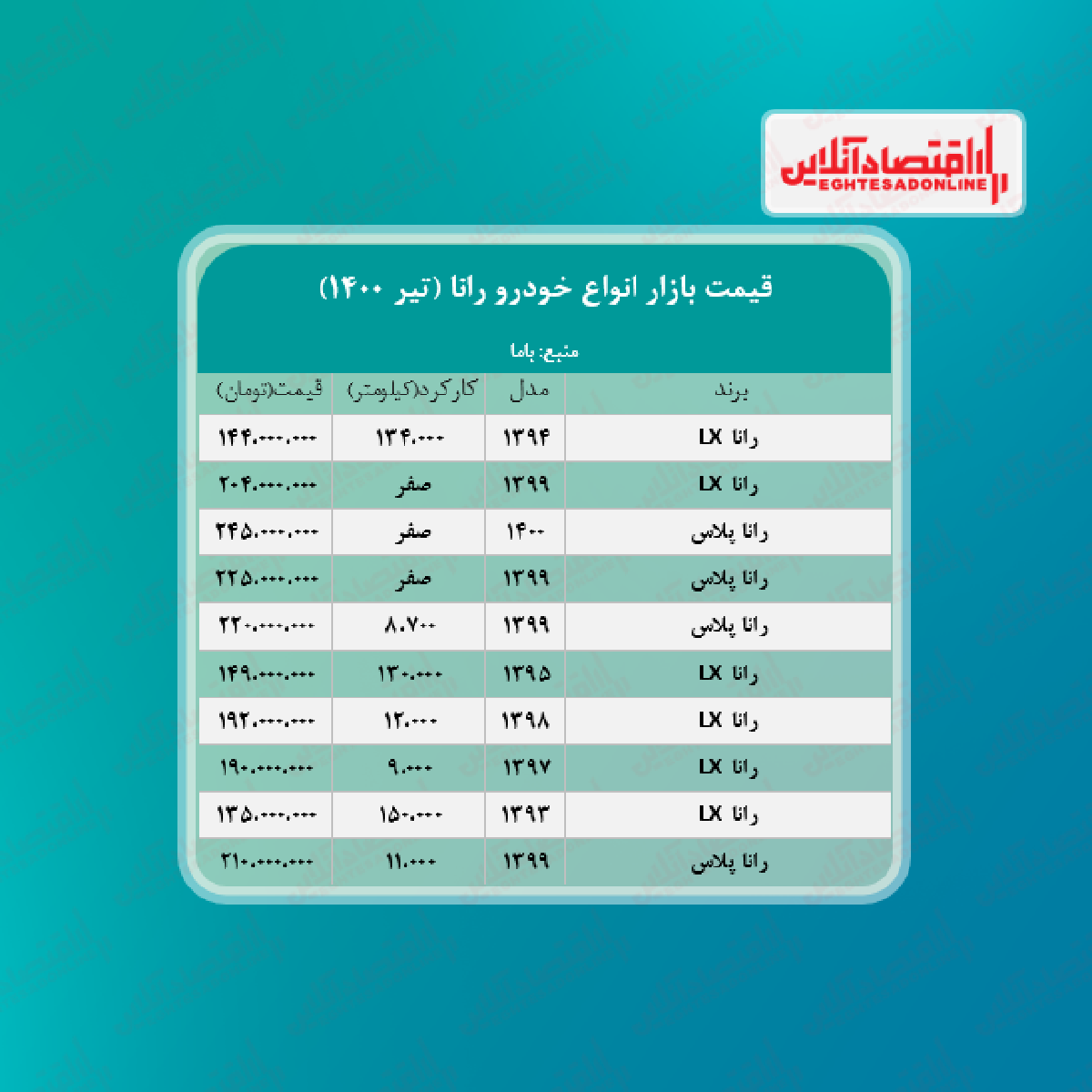 اقتصاد آنلاین - پیام مصطفایی: در جدول زیر قیمت روز انواع رانا در بازار آزاد را مشاهده میکنید.