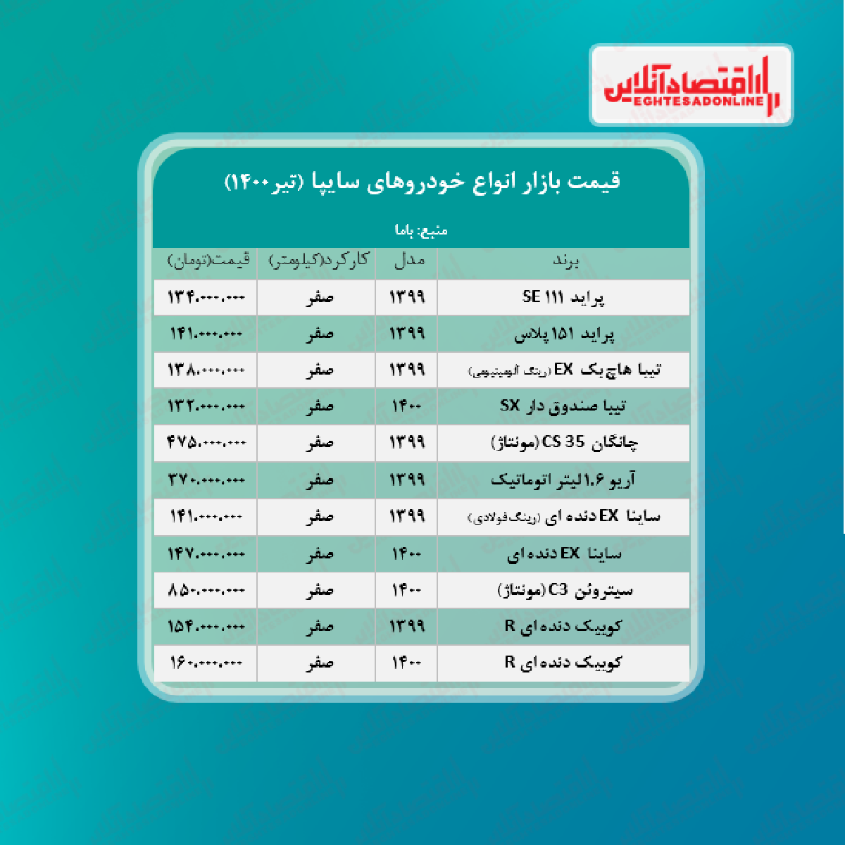 اقتصاد آنلاین - پیام مصطفایی: در جدول زیر قیمت روز محصولات سایپا در بازار آزاد را مشاهده می‌کنید.