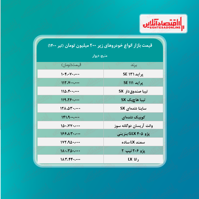 قیمت روز خودروهای دست دوم زیر 200 میلیون بازار