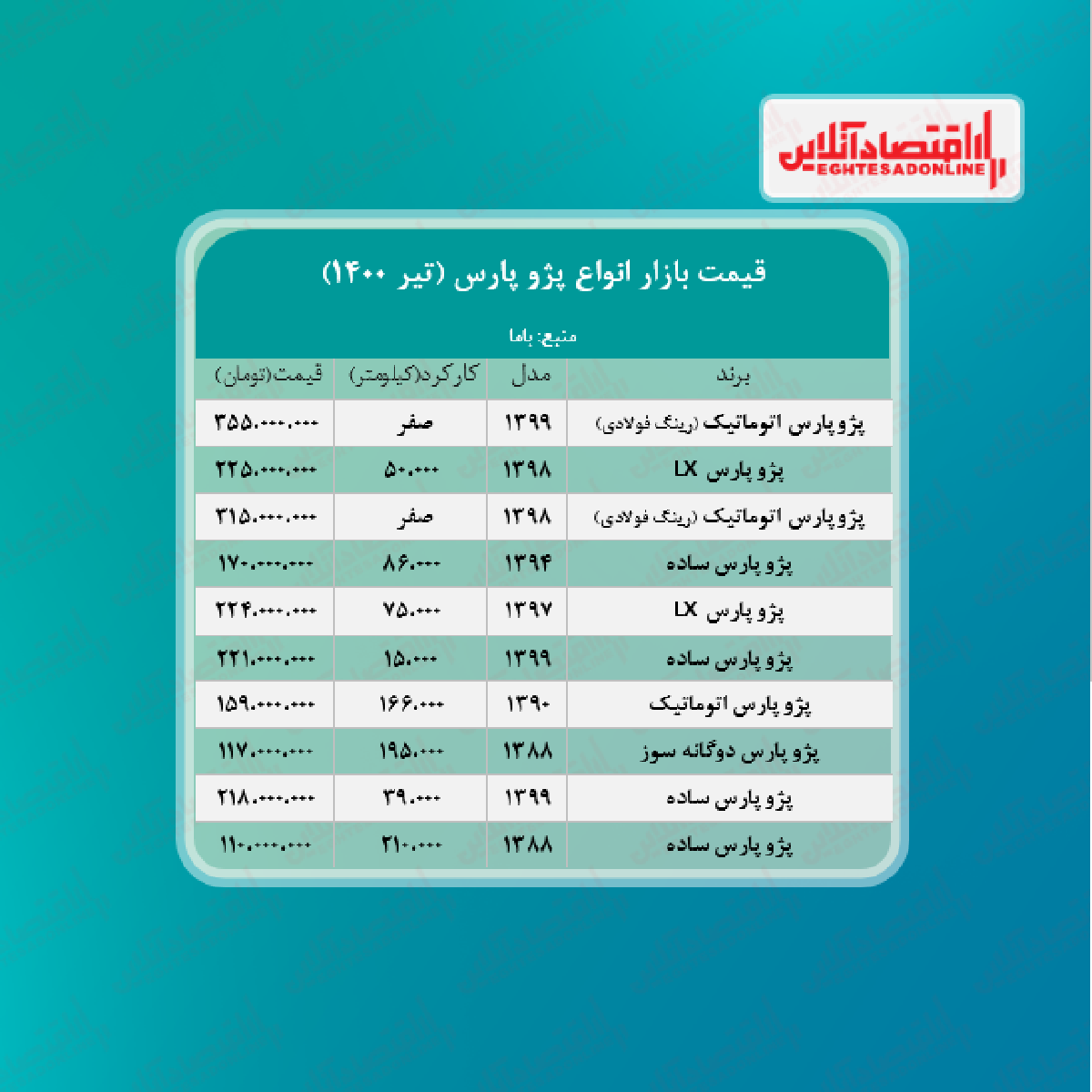 اقتصاد آنلاین - پیام مصطفایی: در جدول زیر قیمت پژو پارس در بازار آزاد را مشاهده میکنید.