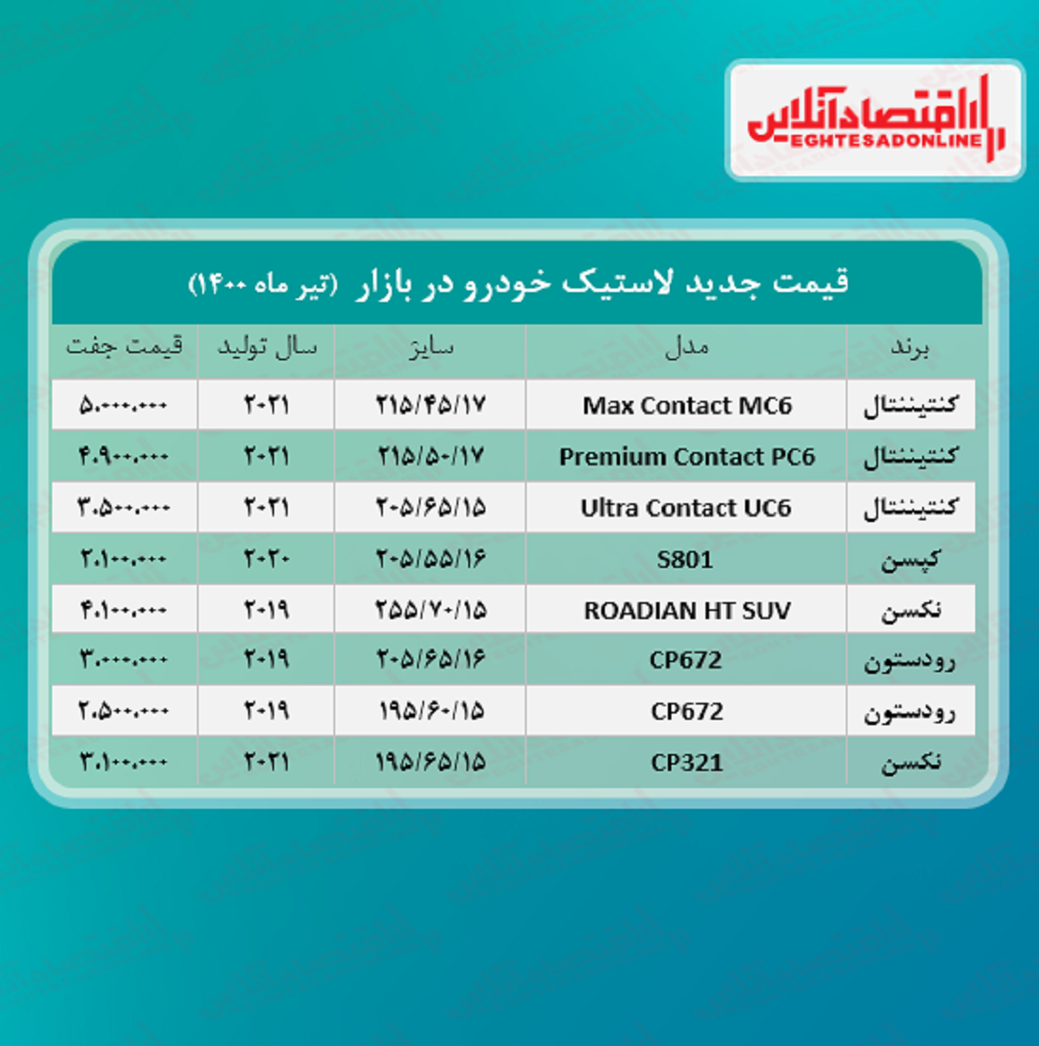 اقتصادآنلاین – فائزه بهرامی: قیمت جدید انواع لاستیک خودرو در سطح بازار تهران به شرح جدول زیر است؛