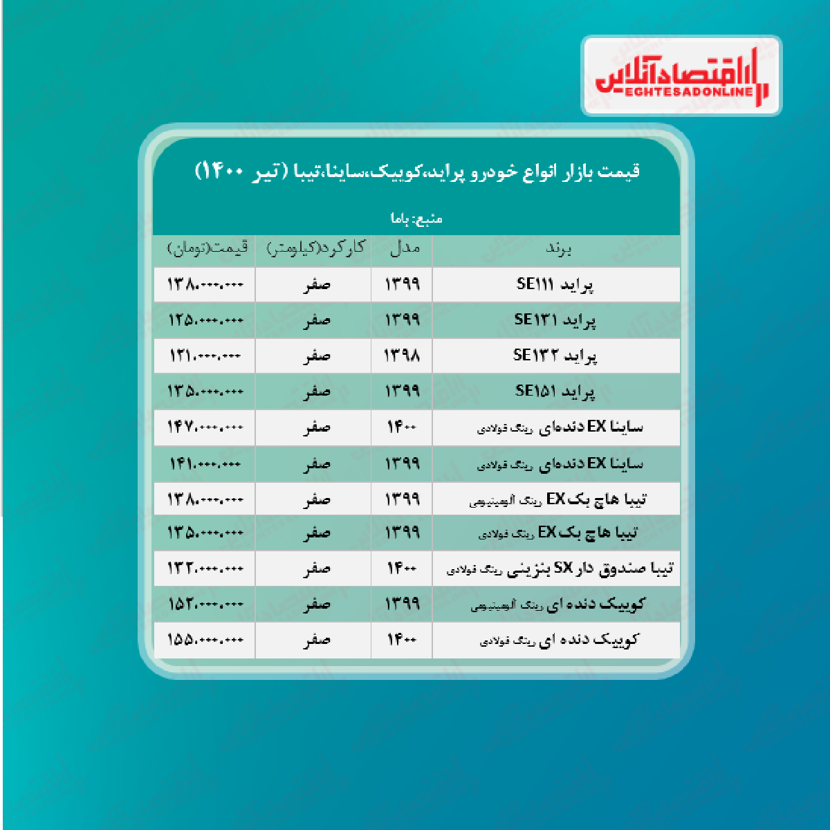اقتصاد آنلاین - پیام مصطفایی: در جدول زیر قیمت روز انواع پراید، تیبا، کوییک و ساینا در بازار آزاد را مشاهده می‌کنید.