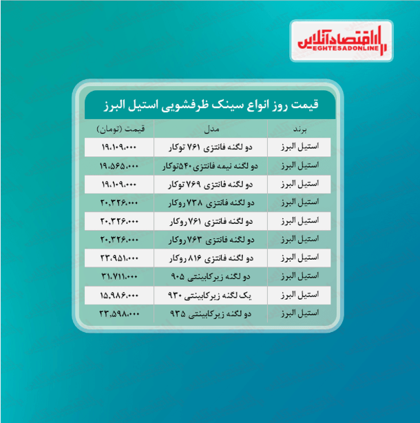 اقتصاد آنلاین - سمانه باقری: آنچه در زیر می‌آید قیمت روز سینک ظرفشویی استیل البرز موجود در سطح بازار است؛