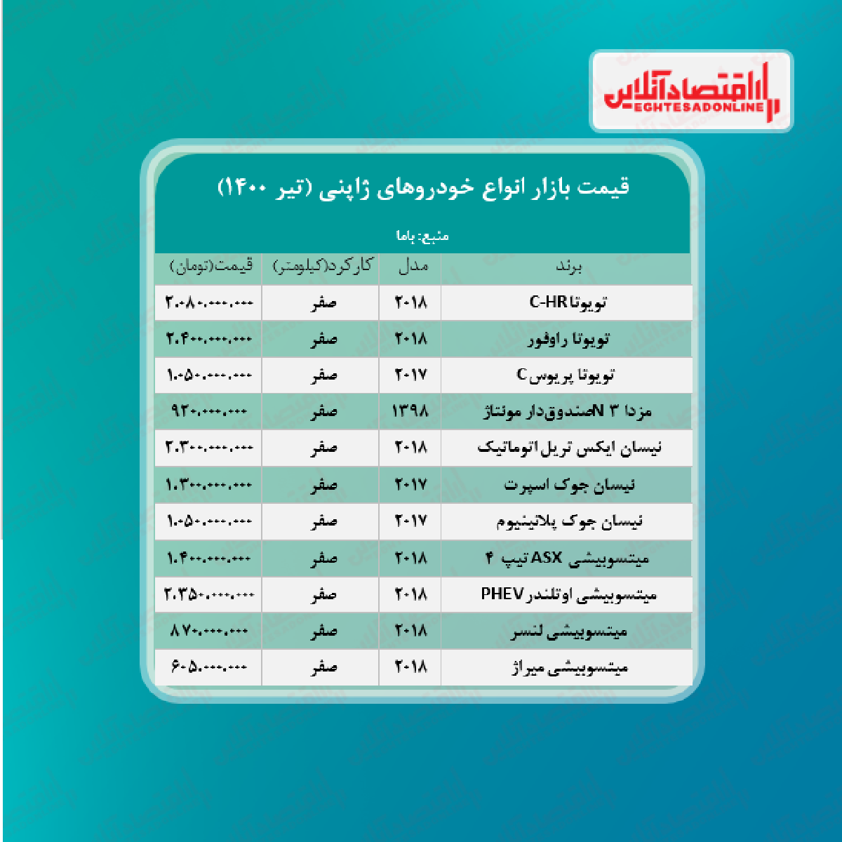اقتصاد آنلاین - پیام مصطفایی: در جدول زیر قیمت روز انواع خودرو ژاپنی در بازار آزاد را مشاهده می‌کنید.