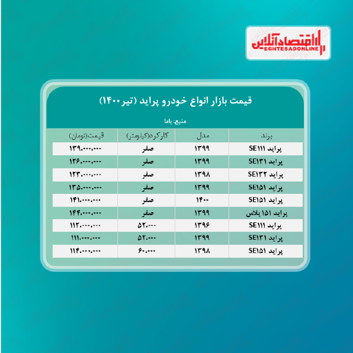 اقتصاد آنلاین - پیام مصطفایی: در جدول زیر قیمت روز انواع پراید را در بازار آزاد مشاهده می‌کنید.