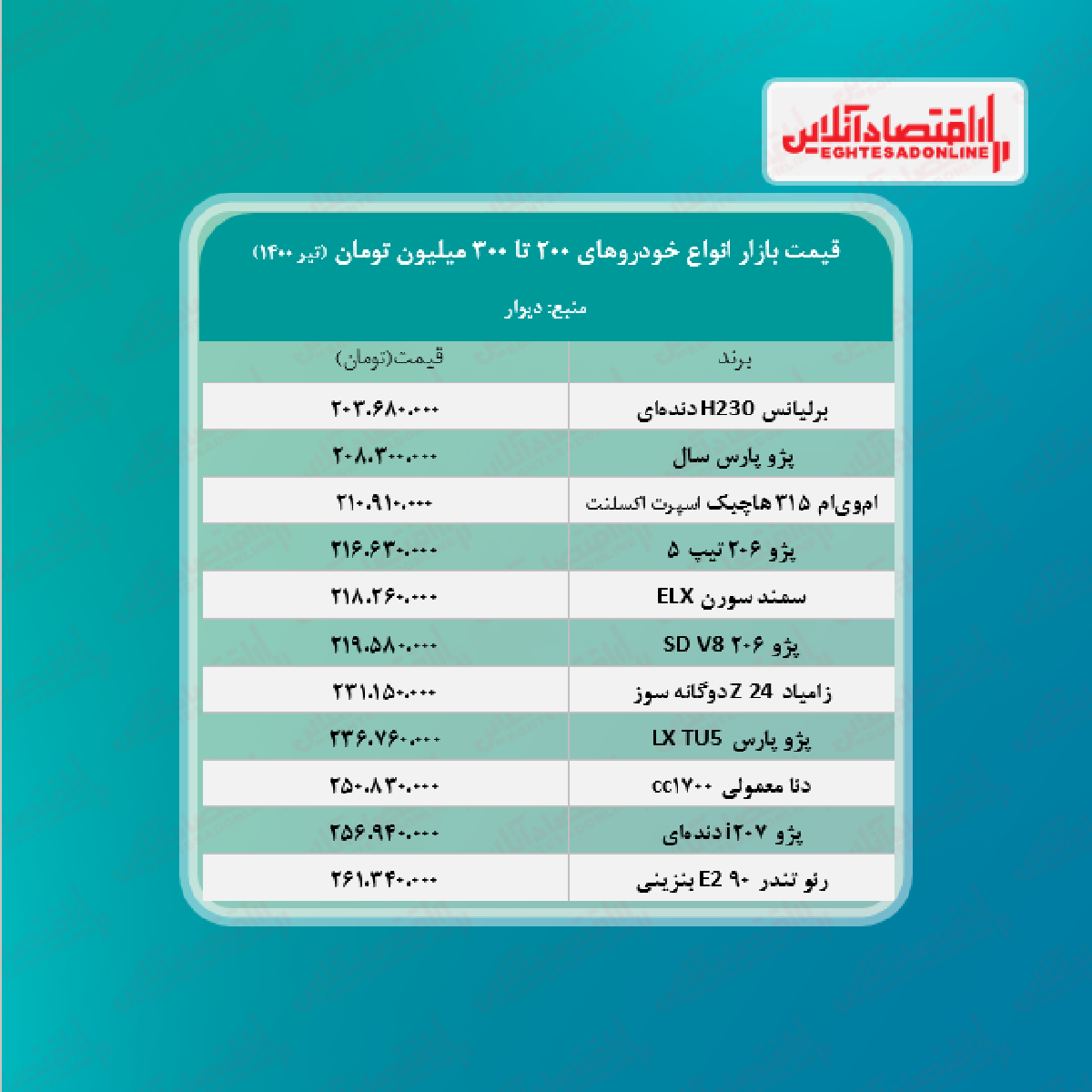 خودروهای ۲۰۰ تا ۳۰۰ میلیون تومان بازار + جدول