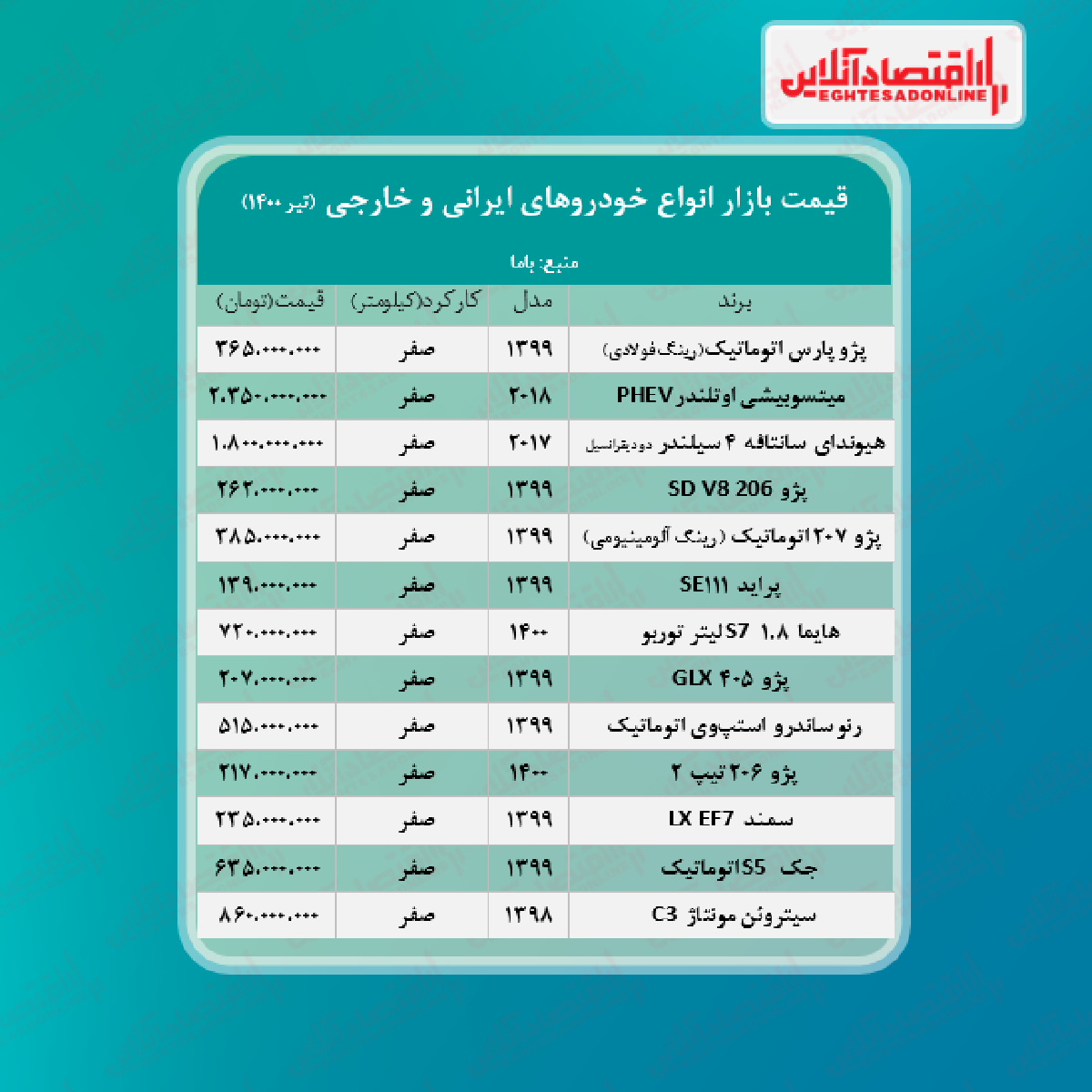 اقتصاد آنلاین - پیام مصطفایی: در جدول زیر قیمت روز انواع خودروهای ایرانی و خارجی را در بازار آزاد مشاهده می‌کنید.