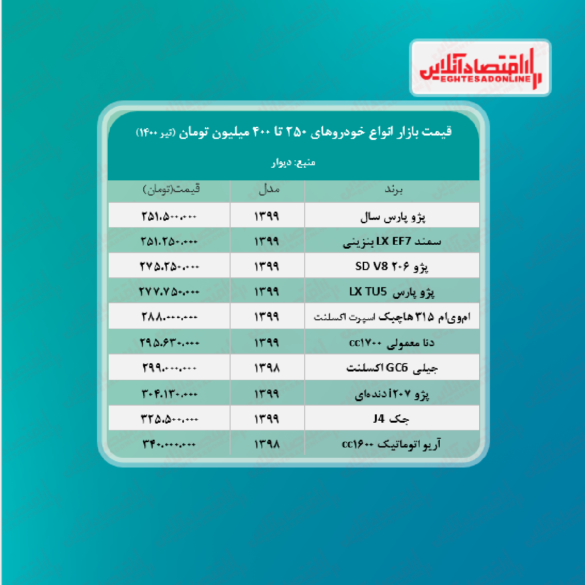 اقتصاد آنلاین - پیام مصطفایی: در جدول زیر قیمت خودروهای سال 250 تا 400 میلیون تومانی در بازار آزاد را مشاهده میکنید.