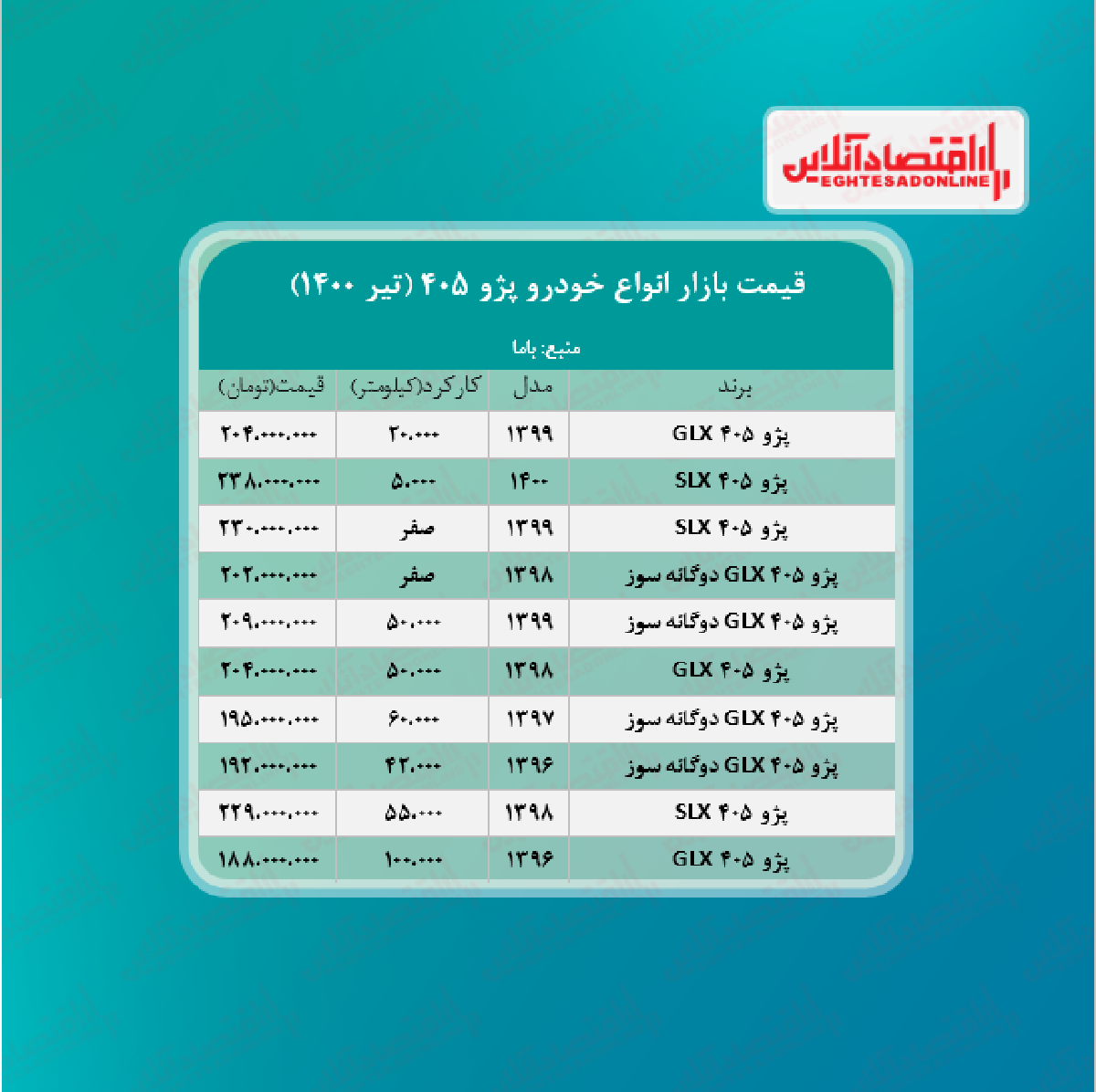 اقتصاد آنلاین - پیام مصطفایی: در جدول زیر قیمت روز انواع پژو 405 در بازار آزاد را مشاهده میکنید.