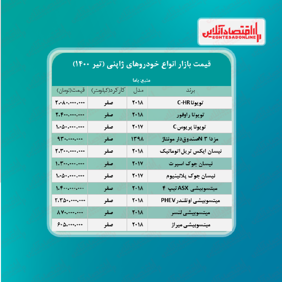 اقتصاد آنلاین - پیام مصطفایی: در جدول زیر قیمت روز انواع خودرو ژاپنی در بازار آزاد را مشاهده می‌کنید.