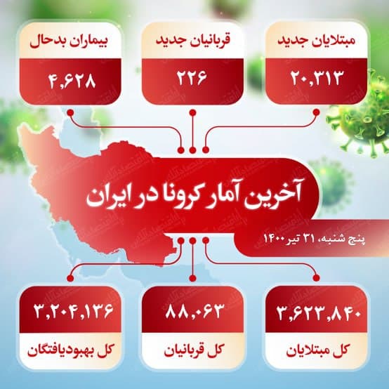آخرین آمار کرونا در ایران (۱۴۰۰/۴/۳۱)