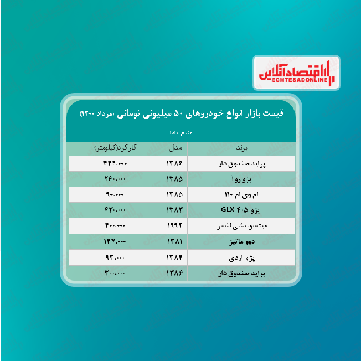 اقتصاد آنلاین - پیام مصطفایی: در جدول زیر لیست خودروهایی را مشاهده می‌کنید که این روزها با 50 میلیون تومان در بازار آزاد معامله می‌شود؛