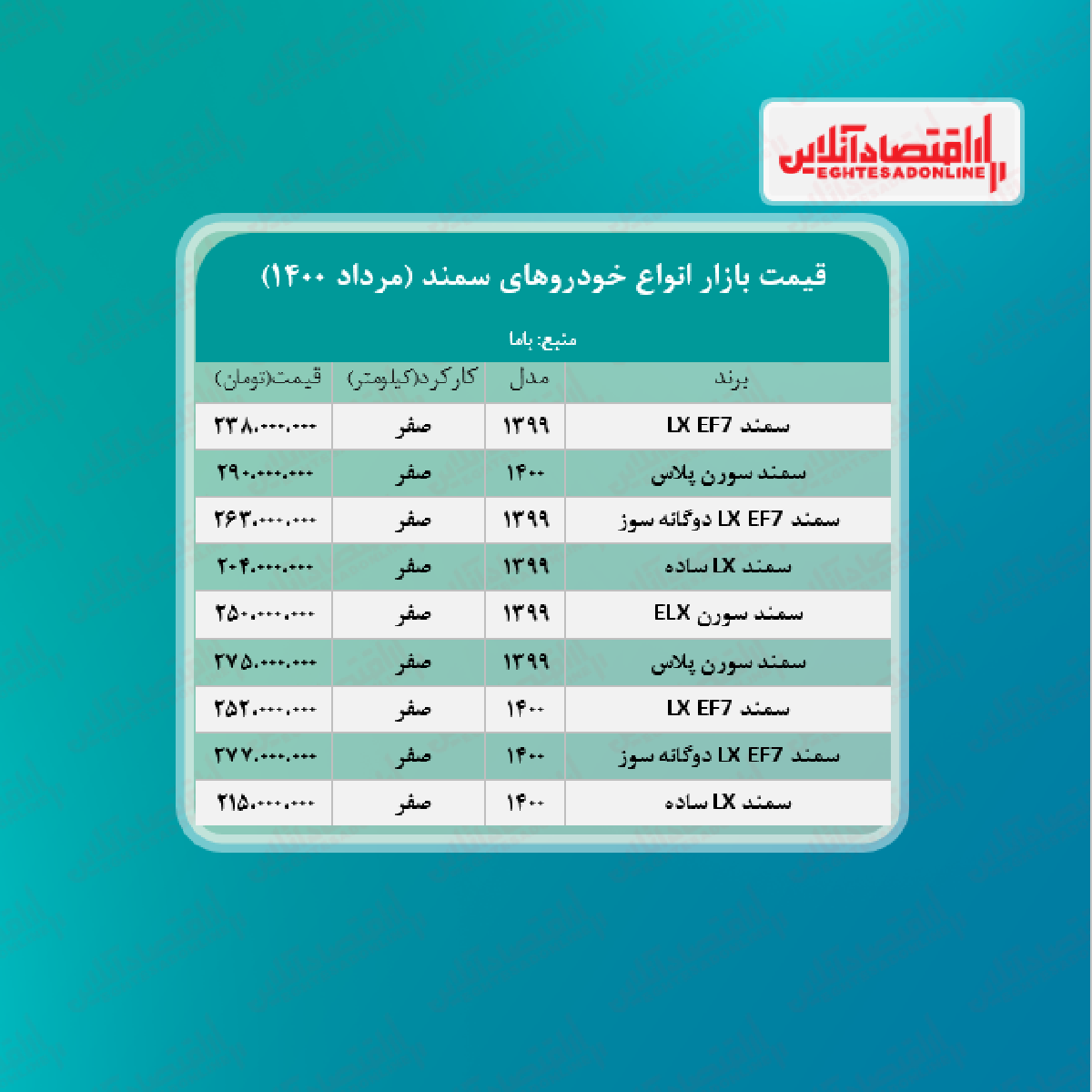 اقتصاد آنلاین - پیام مصطفایی: در جدول زیر قیمت روز انواع سمند در بازار آزاد را مشاهده میکنید.