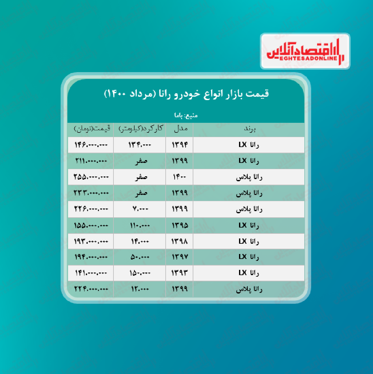 اقتصاد آنلاین - پیام مصطفایی: در جدول زیر قیمت روز انواع رانا در بازار آزاد را مشاهده میکنید.