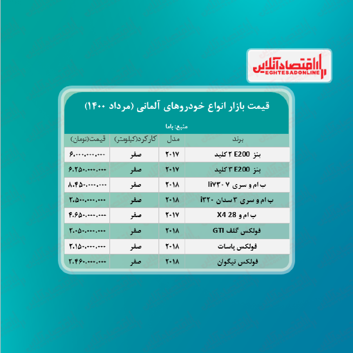 در جدول زیر قیمت روز خودروهای آلمانی در بازار آزاد را مشاهده میکنید.
