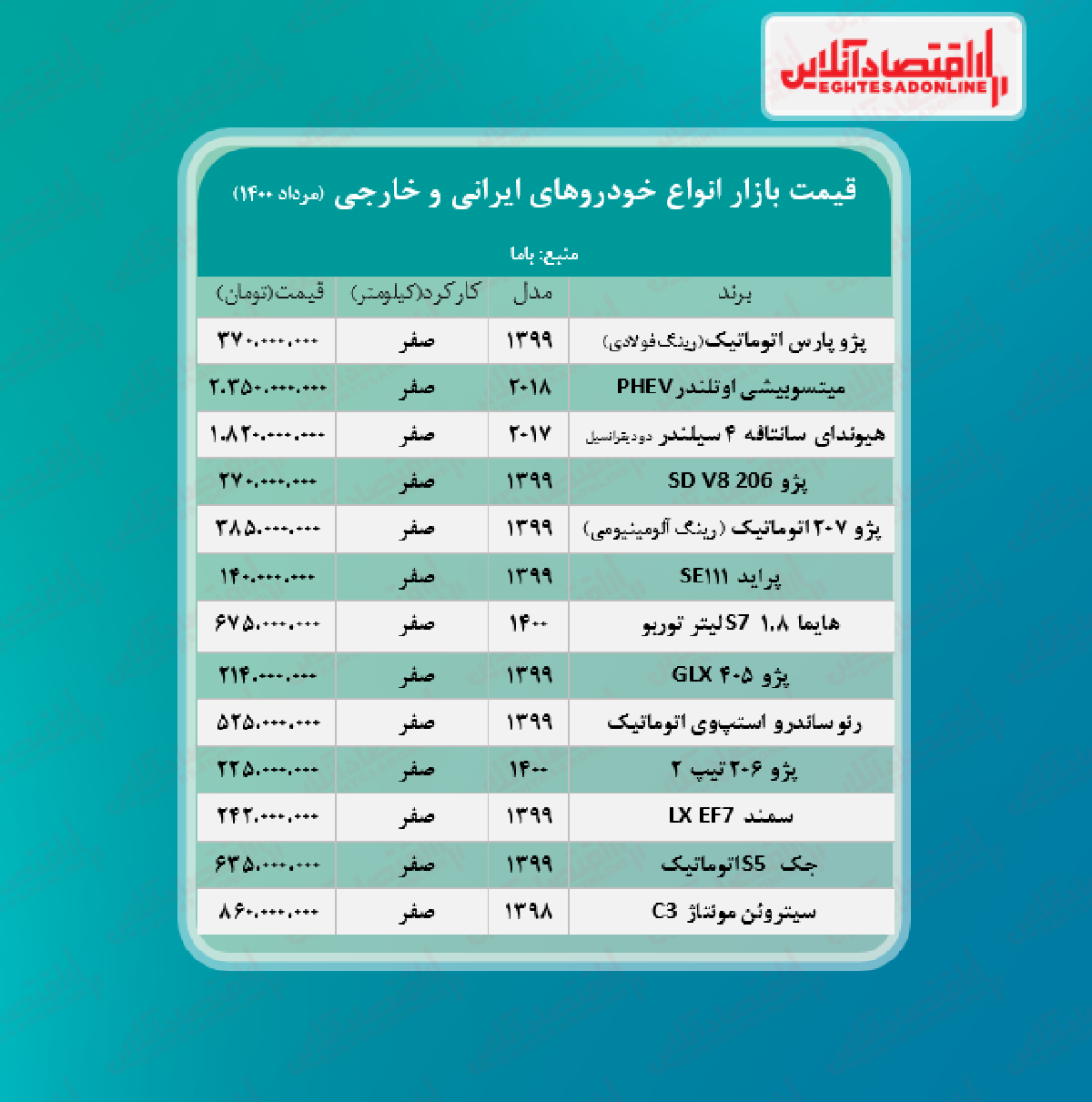 اقتصاد آنلاین - پیام مصطفایی: در جدول زیر قیمت روز انواع خودروهای ایرانی و خارجی را در بازار آزاد مشاهده میکنید.