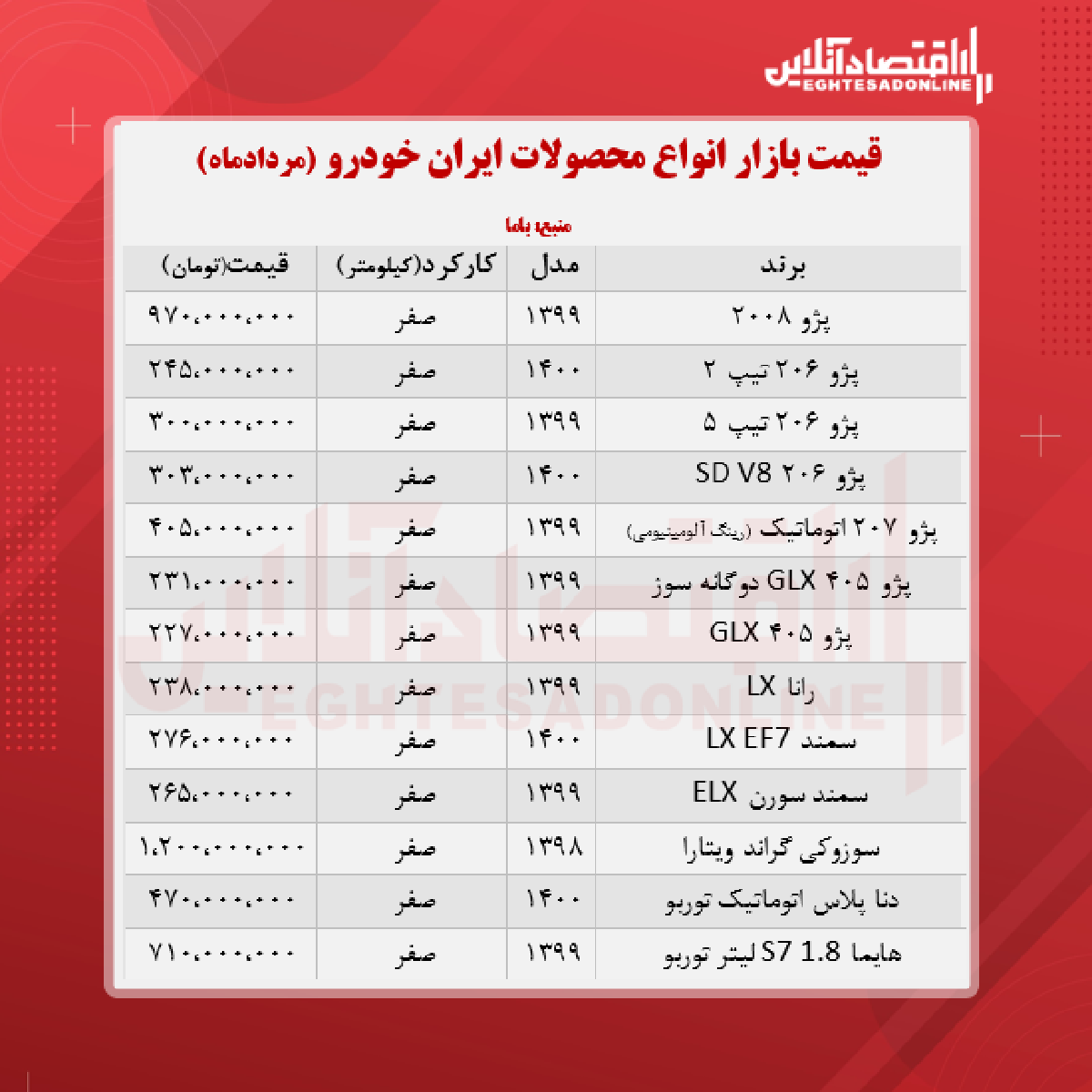 اقتصاد آنلاین - پیام مصطفایی: در جدول زیر قیمت روز محصولات ایران خودرو در بازار آزاد را مشاهده می‌کنید.