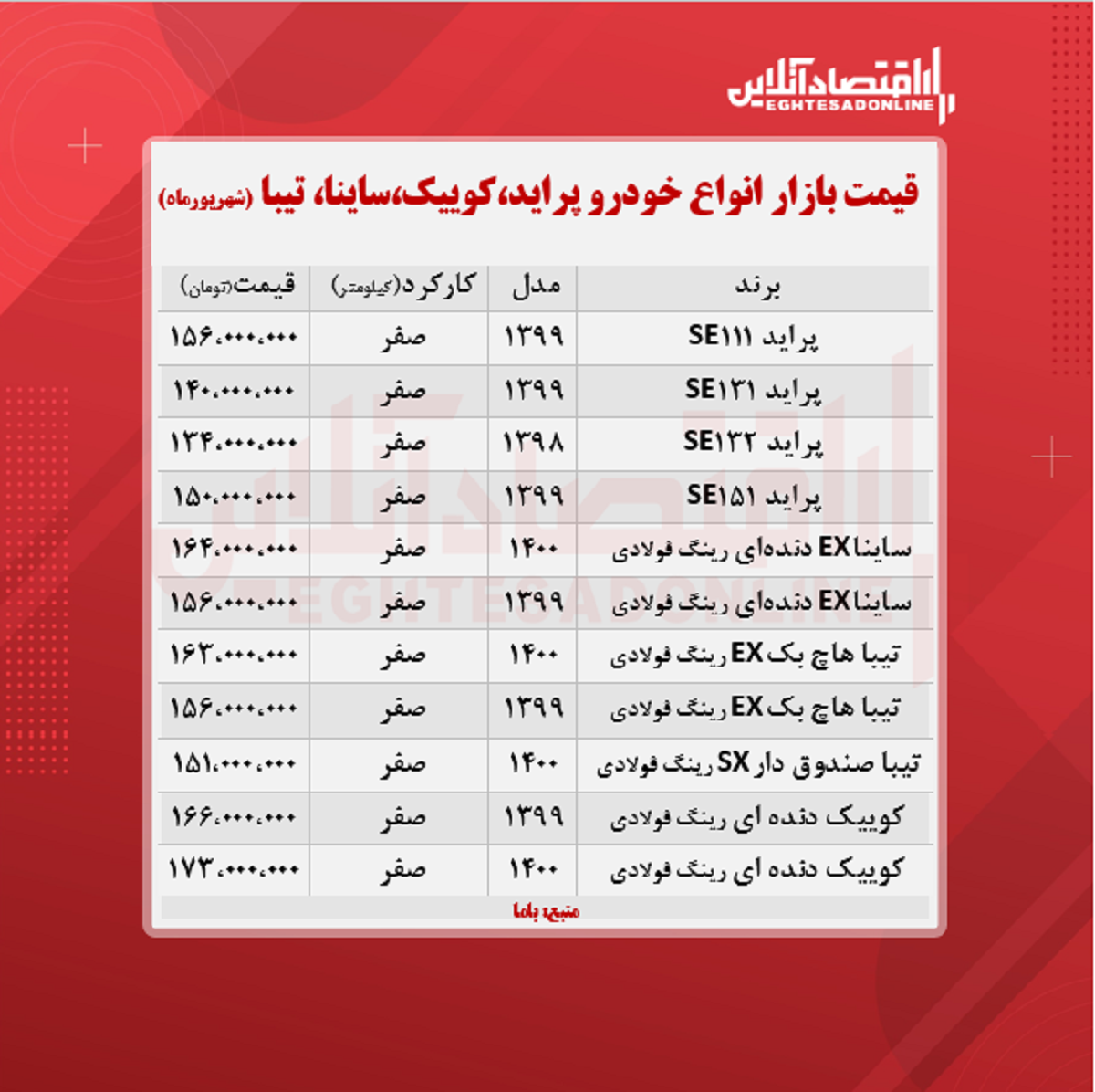 اقتصاد آنلاین - پیام مصطفایی: در جدول زیر قیمت روز انواع پراید، تیبا، کوییک و ساینا در بازار آزاد را مشاهده می‌کنید.
