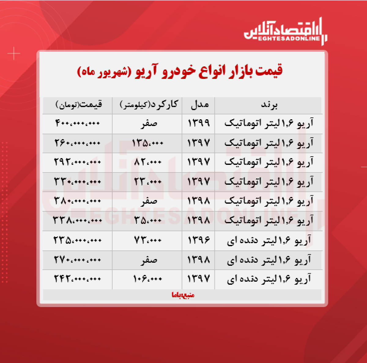 آریو ۴۰۰ میلیون تومان شد + جدول