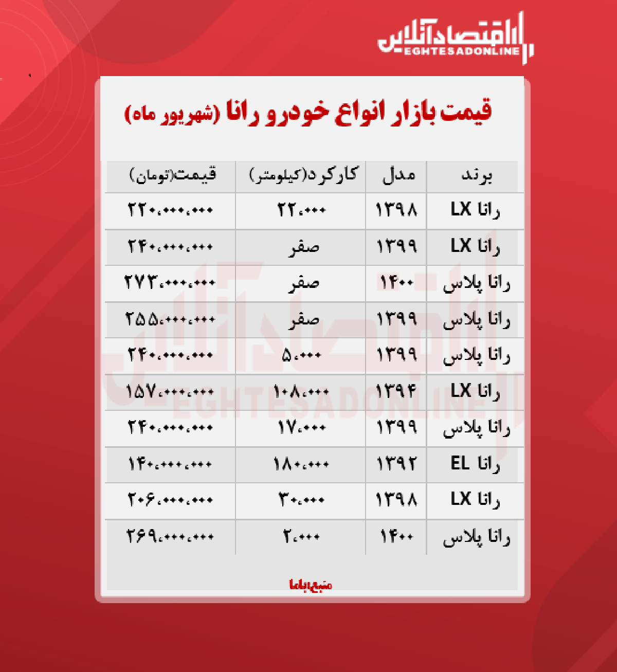 اقتصاد آنلاین - پیام مصطفایی: در جدول زیر قیمت روز انواع رانا در بازار آزاد را مشاهده میکنید.