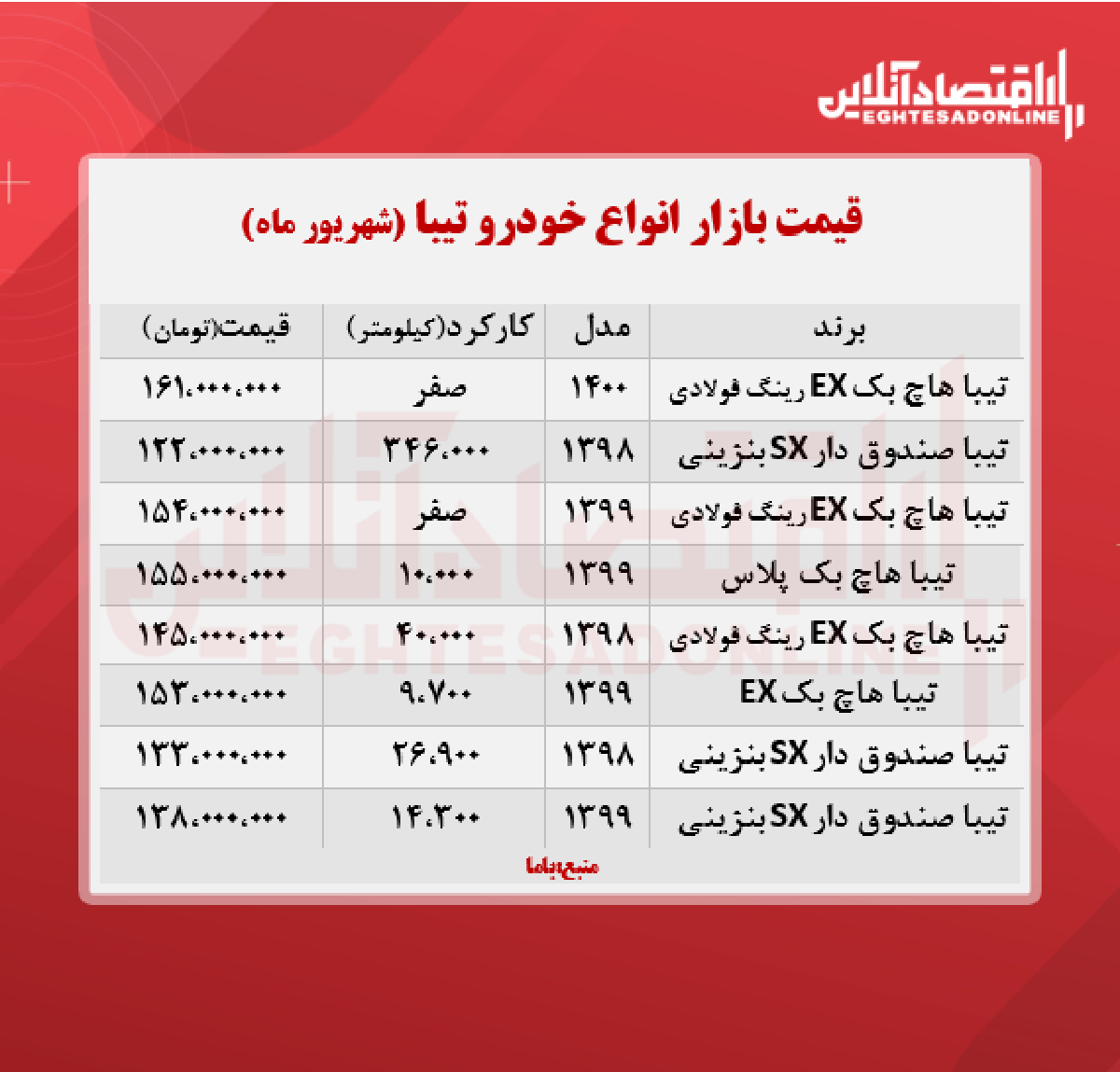 اقتصاد آنلاین - پیام مصطفایی: در جدول زیر قیمت روز انواع تیبا در بازار آزاد را مشاهده میکنید.