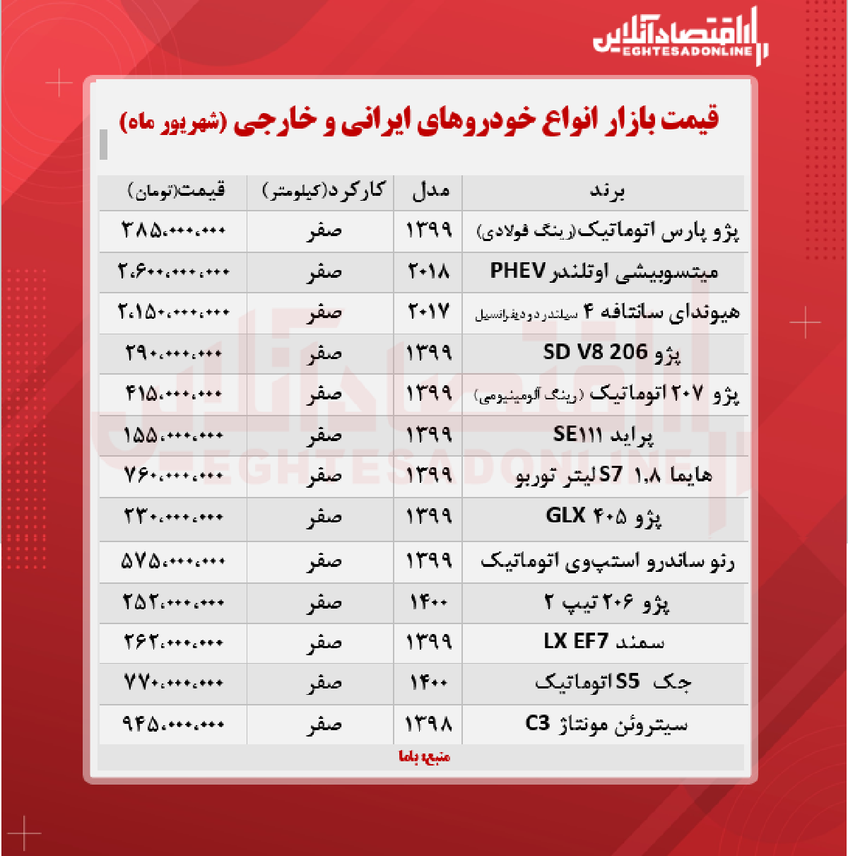 اقتصاد آنلاین - پیام مصطفایی: در جدول زیر قیمت روز انواع خودروهای ایرانی و خارجی را در بازار آزاد مشاهده میکنید.