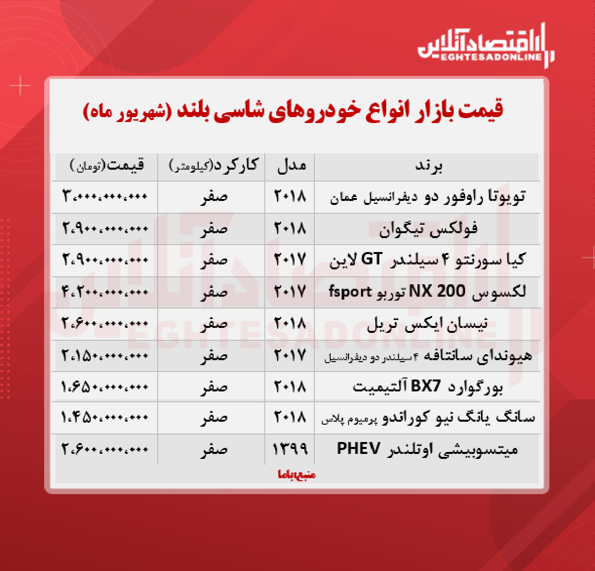 اقتصاد آنلاین - پیام مصطفایی: در جدول زیر قیمت روز انواع خودروهای شاسی بلند را در بازار آزاد مشاهده میکنید.