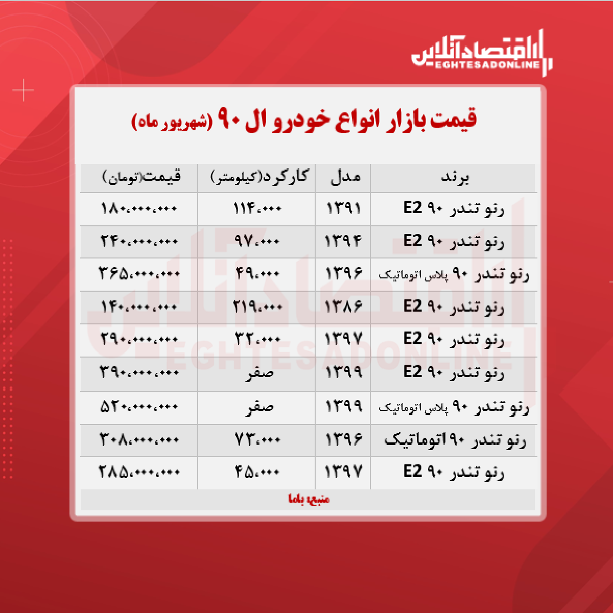 ال ۹۰، ۳۹۰ میلیون تومان شد + جدول