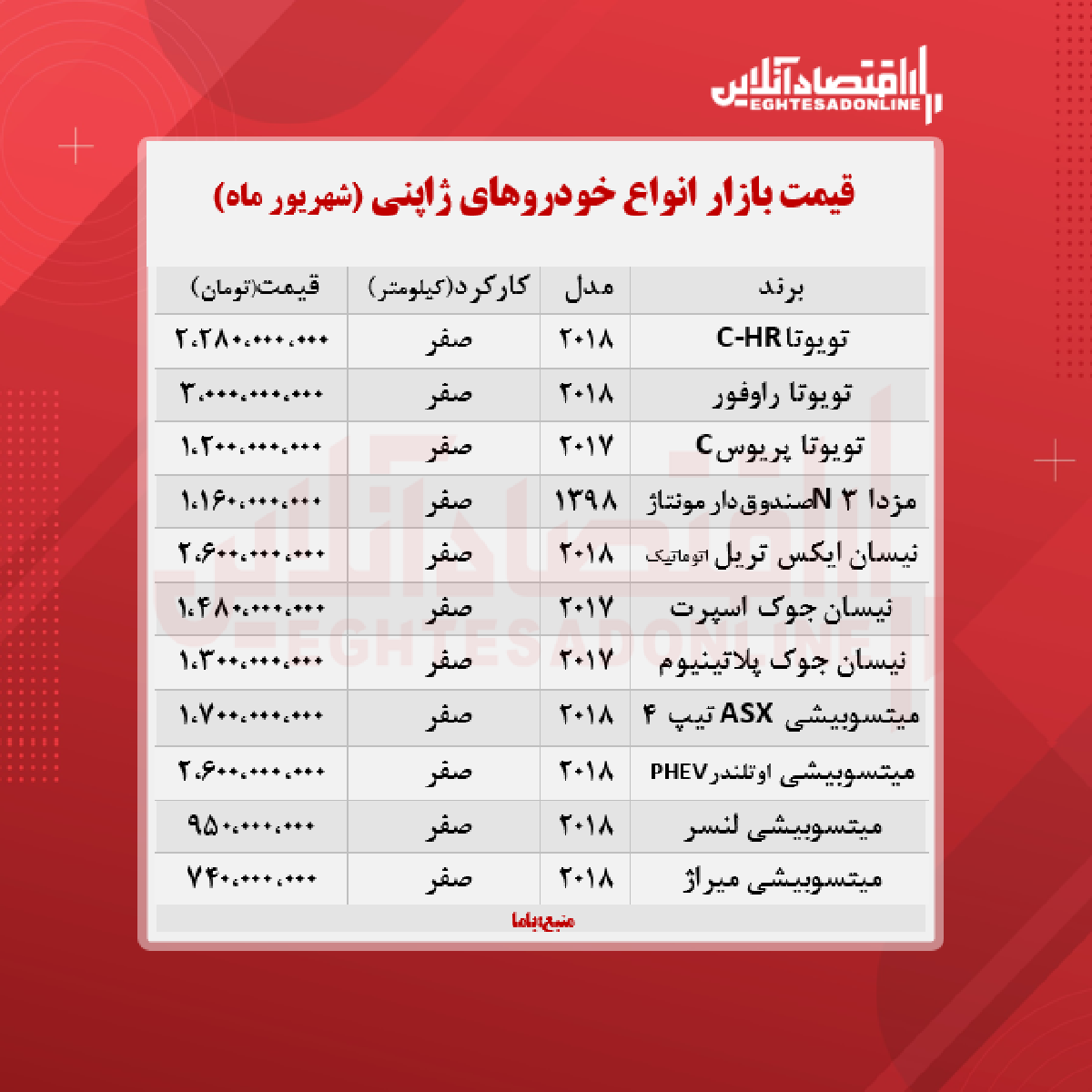 اقتصاد آنلاین - پیام مصطفایی: در جدول زیر قیمت روز انواع خودرو ژاپنی در بازار آزاد را مشاهده می‌کنید.