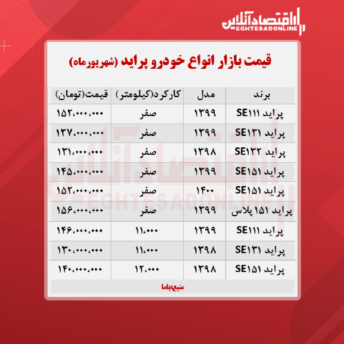اقتصاد آنلاین - پیام مصطفایی: در جدول زیر قیمت روز انواع پراید را در بازار آزاد مشاهده میکنید.