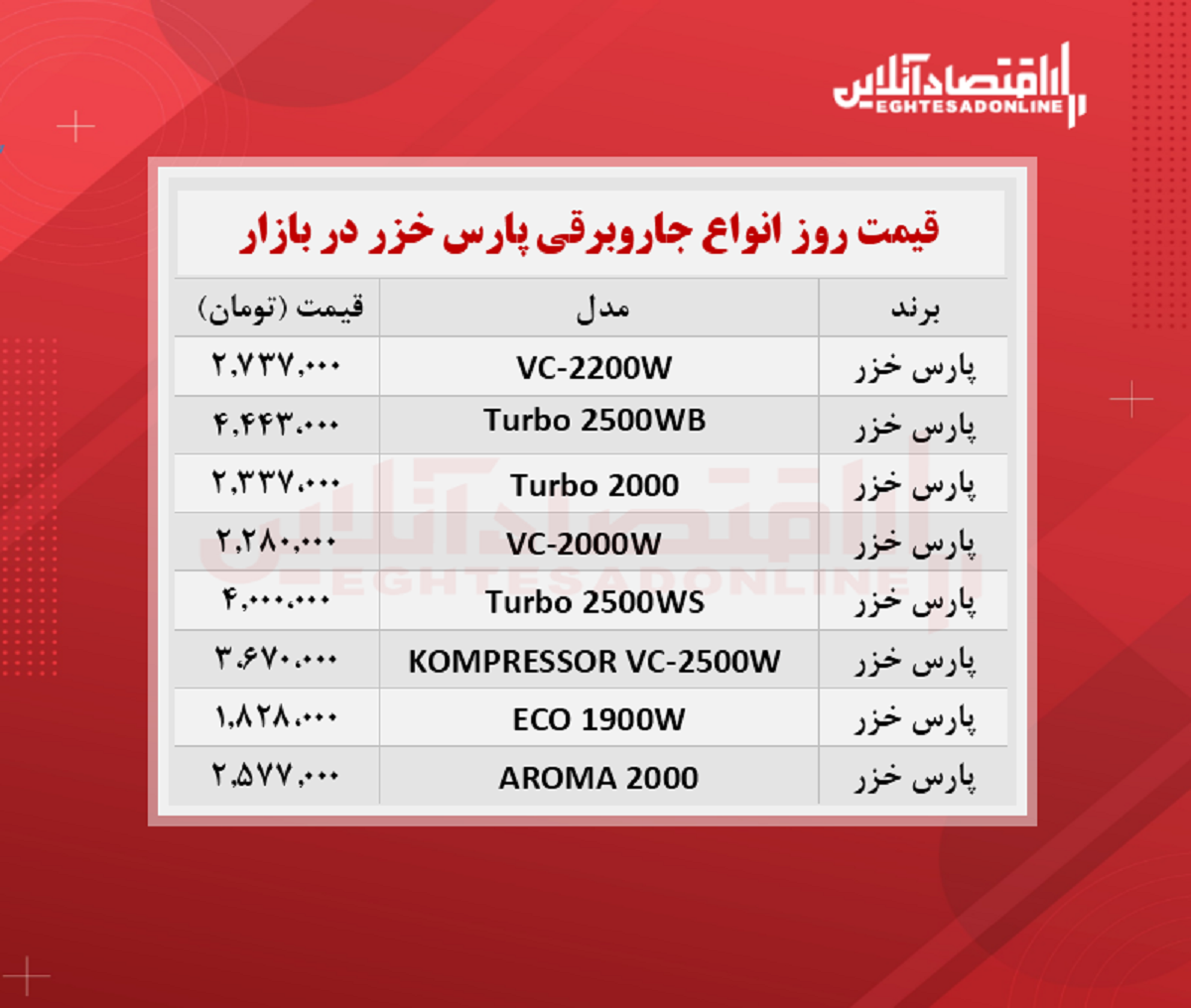 اقتصاد آنلاین -سمانه‌ باقری: آنچه در زیر می‌آید جدول قیمت روز انواع جاروبرقی‌ برند پارس خزر در سایت‌های فروش اینترنتی است؛