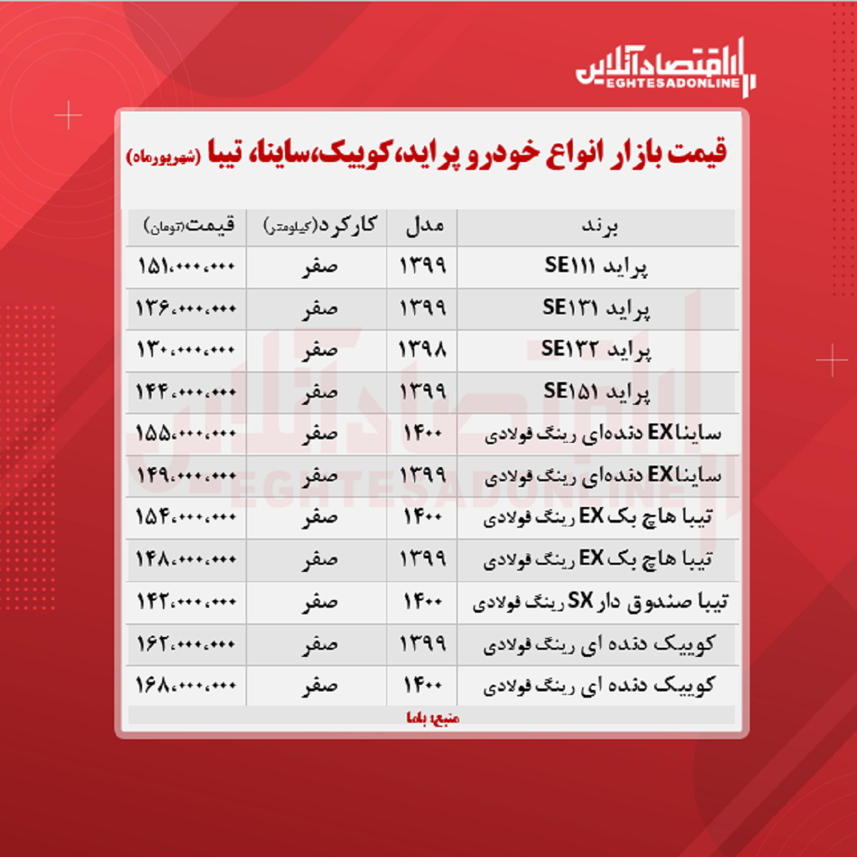 اقتصاد آنلاین - پیام مصطفایی: در جدول زیر قیمت روز انواع پراید، تیبا، کوییک و ساینا در بازار آزاد را مشاهده میکنید.