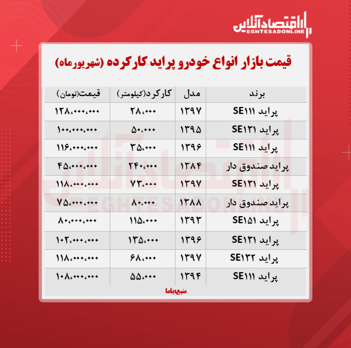 اقتصاد آنلاین - پیام مصطفایی: در جدول زیر قیمت روز انواع پراید کارکرده در بازار آزاد را مشاهده میکنید.