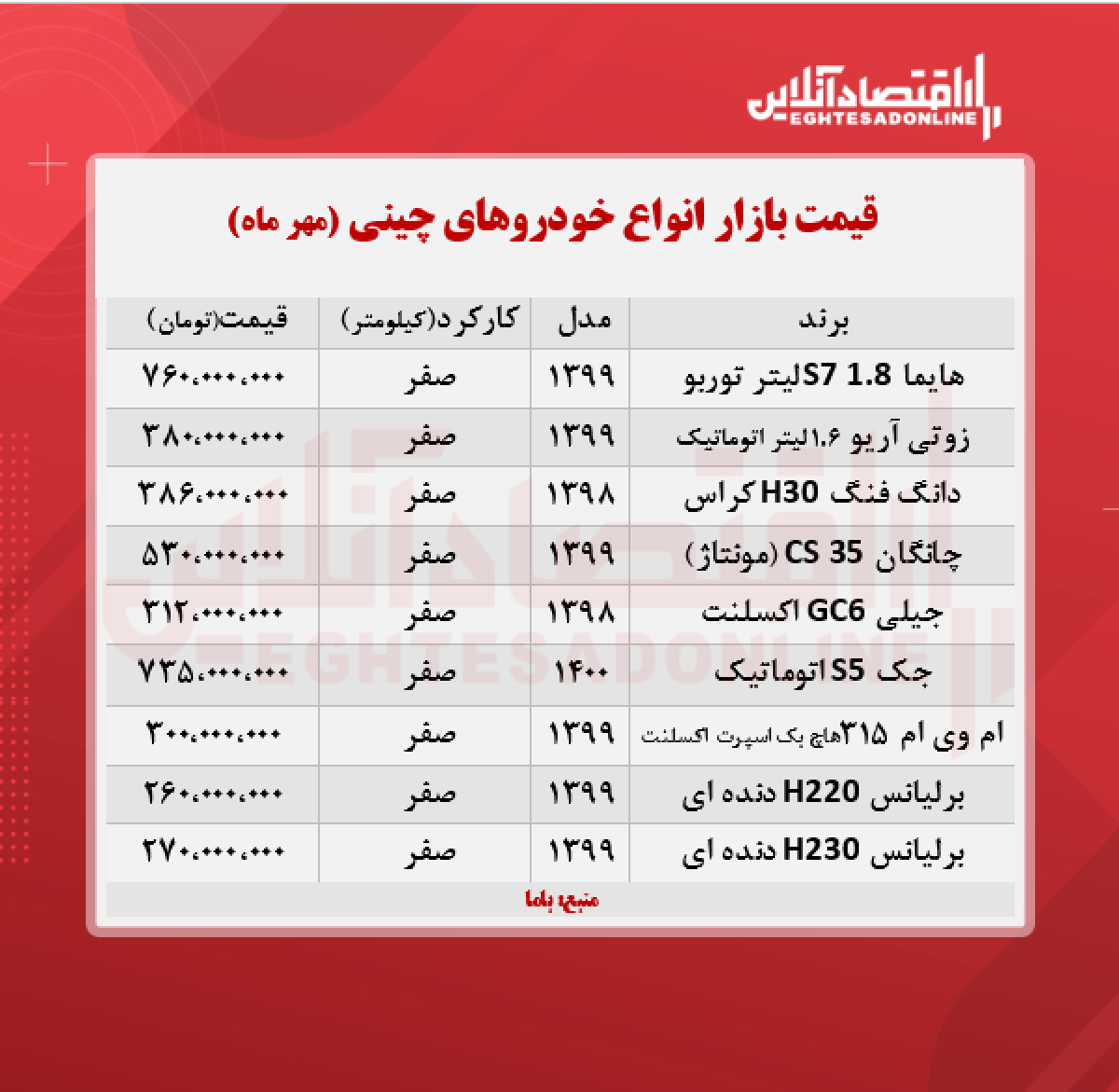 اقتصاد آنلاین - پیام مصطفایی: در جدول زیر قیمت روز خودروهای چینی در بازار آزاد را مشاهده می‌کنید.