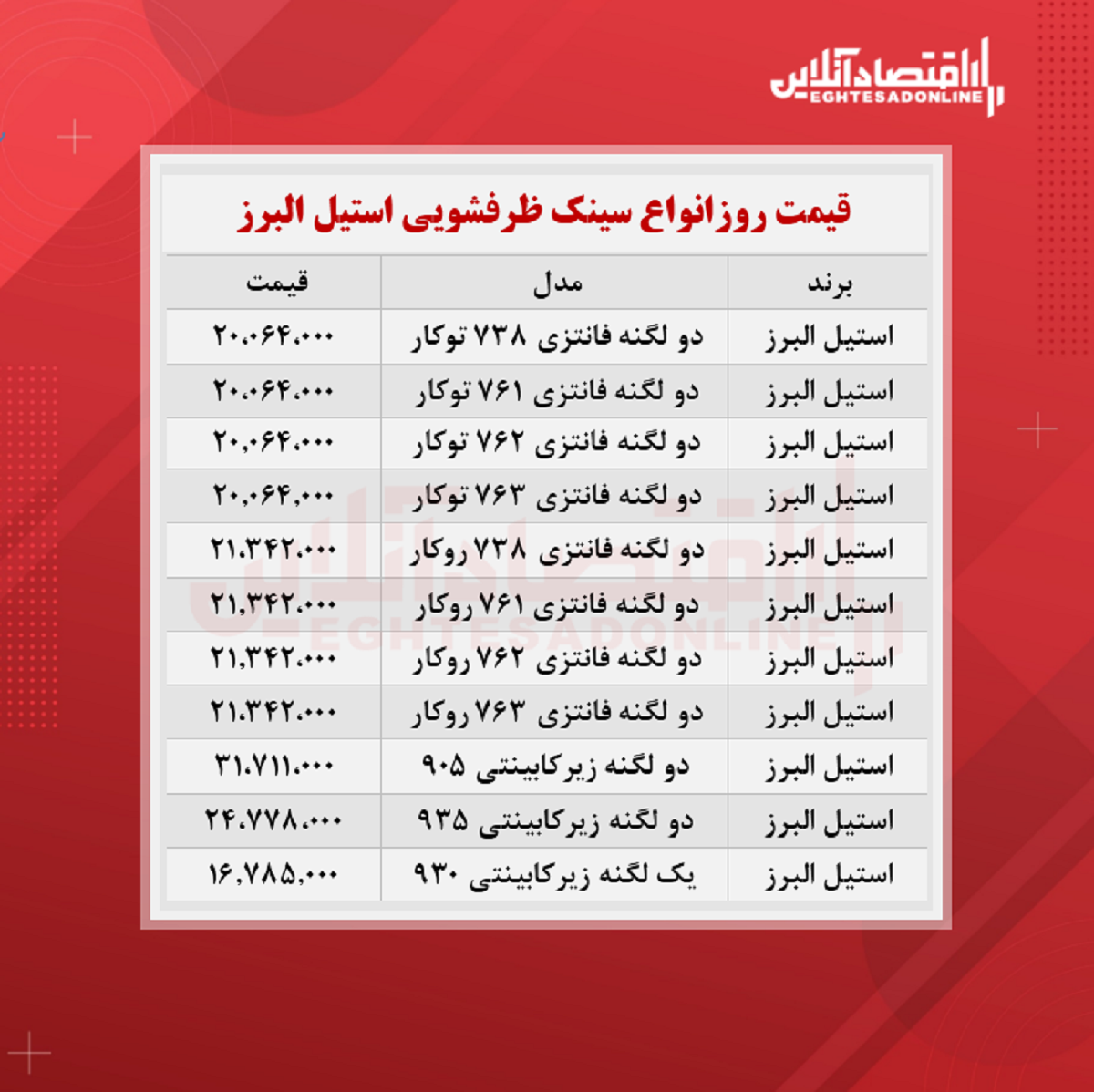 اقتصاد آنلاین - سمانه باقری: آنچه در زیر می‌آید قیمت روز سینک ظرفشویی استیل البرز موجود در سطح بازار است؛