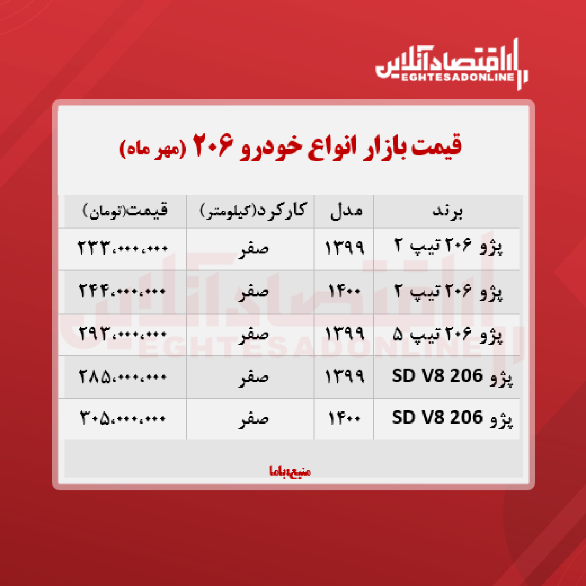 اقتصاد آنلاین - پیام مصطفایی: در جدول زیر قیمت روز انواع خودرو ۲۰۶ در بازار آزاد را مشاهده می‌کنید.