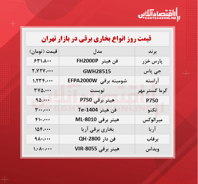 اقتصاد آنلاین - سمانه باقری: آنچه در زیر میآید جدول قیمت جدید انواع بخاری برقی در سایتهای فروش اینترنتی است؛