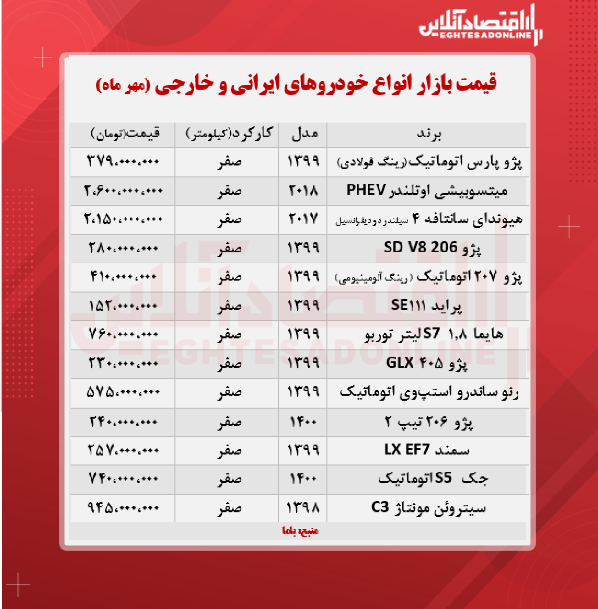 اقتصاد آنلاین - پیام مصطفایی: در جدول زیر قیمت روز انواع خودروهای ایرانی و خارجی را در بازار آزاد مشاهده میکنید.