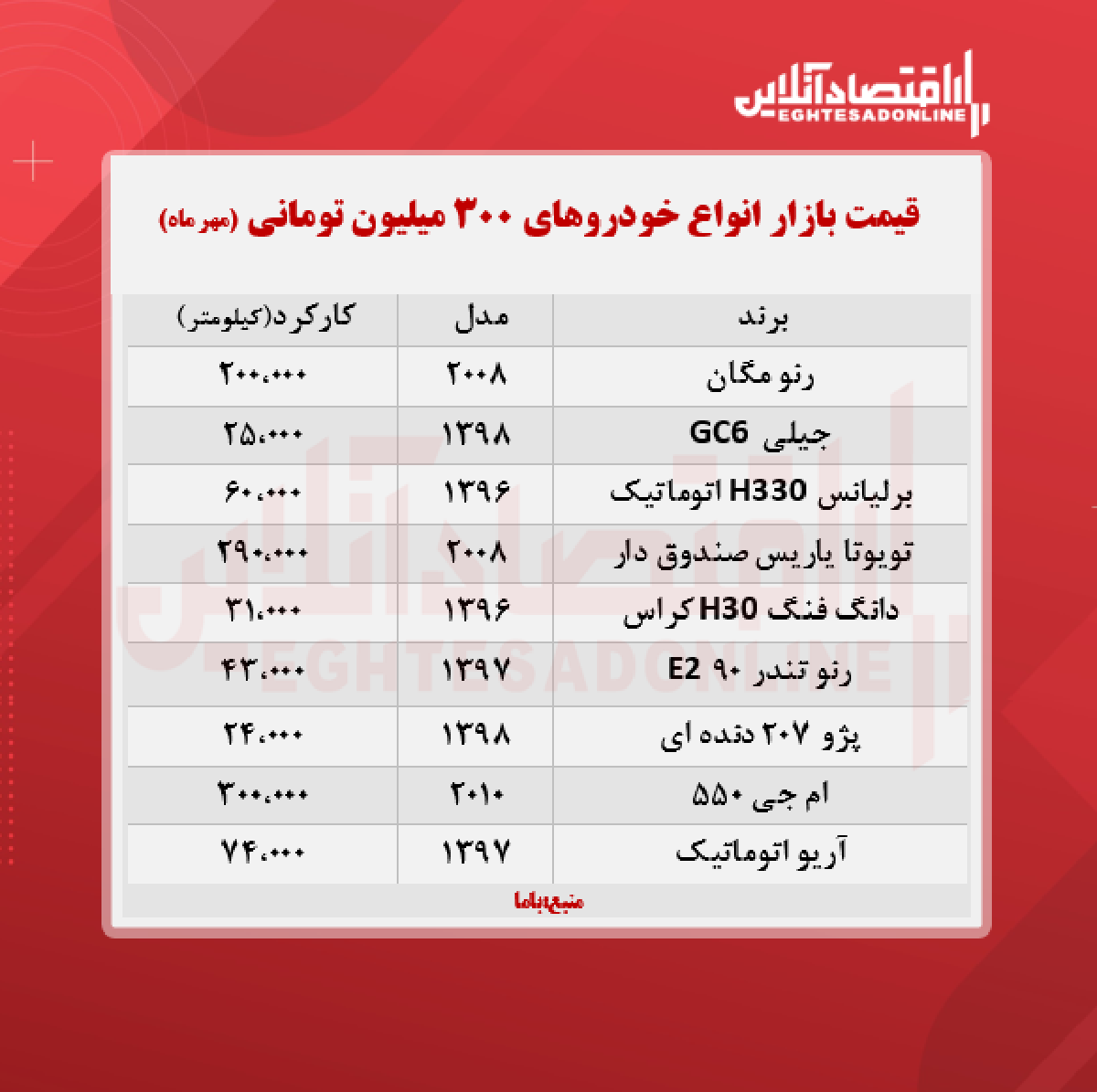 اقتصاد آنلاین - پیام مصطفایی: در جدول زیر لیست خودروهایی را مشاهده میکنید که این روزها با 300 میلیون تومان در بازار آزاد معامله میشود؛