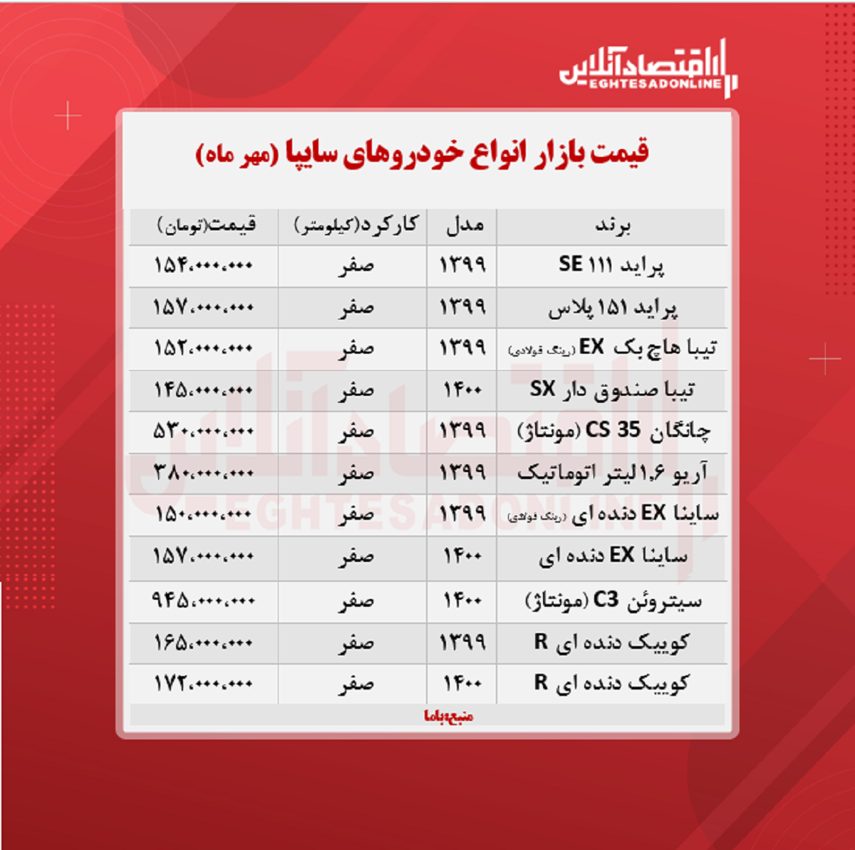 اقتصاد آنلاین - پیام مصطفایی: در جدول زیر قیمت روز محصولات سایپا در بازار آزاد را مشاهده میکنید.